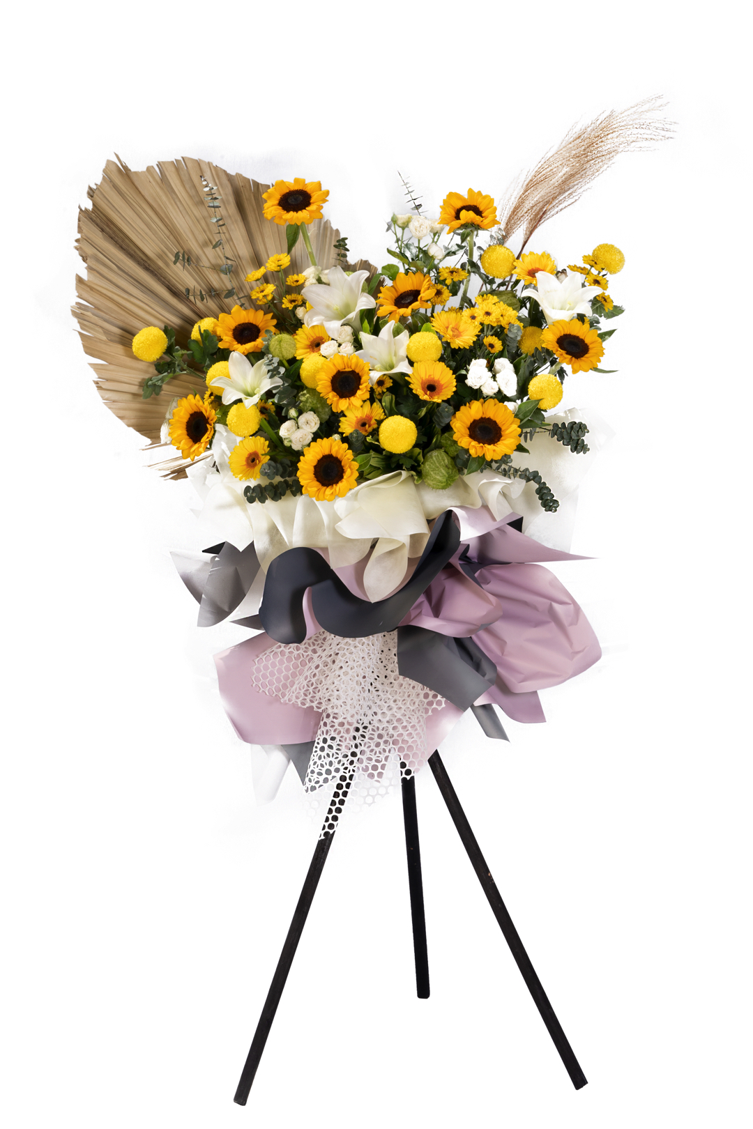 Congratulations are in order. Wishes of good luck and a prosperous business with this bright and stately floral stand.