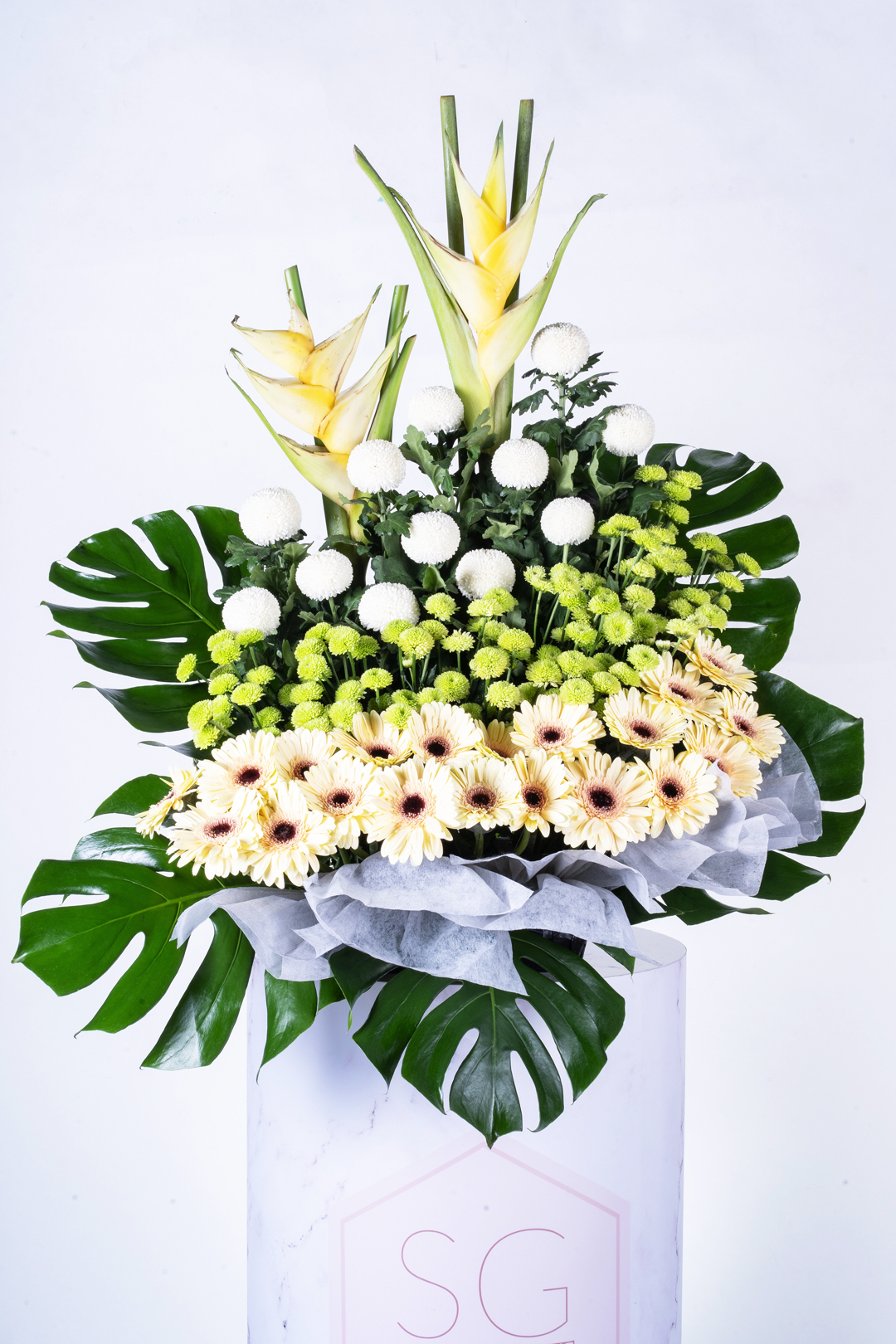 A resplendent and dignified floral stand that represents care, love and respect. A dignified tribute to the departed.