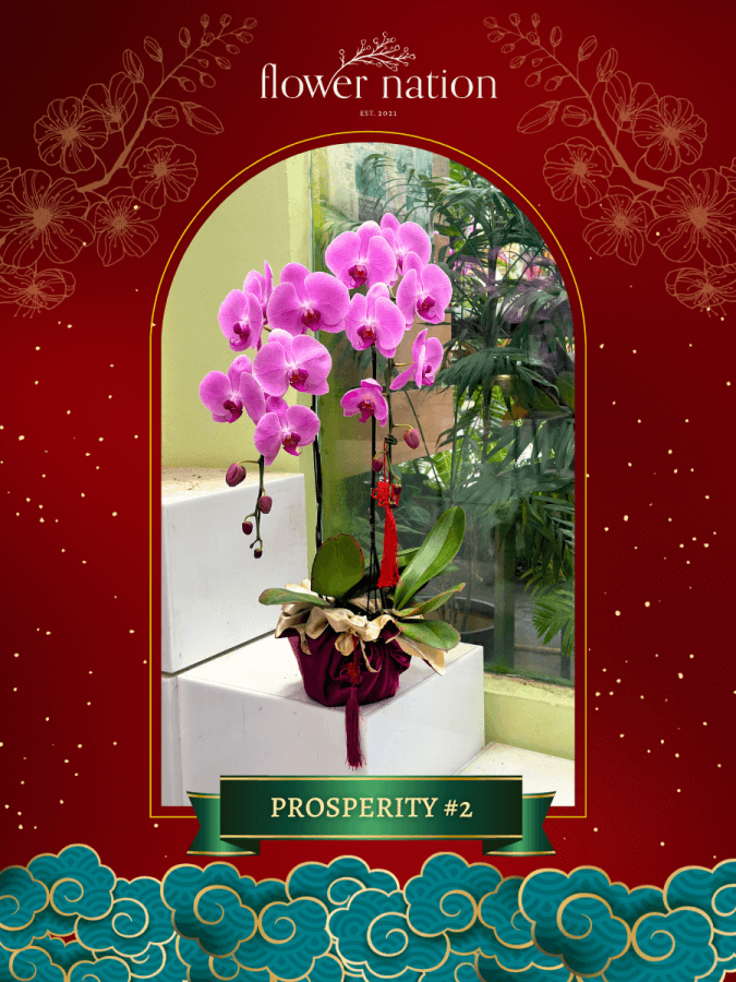 A beautiful flower pot features a stunning arrangement of orchids in shades of pink and purple, symbolising wealth and success. The pot has a red leather base with CNY design and ornaments, adding a touch of elegance and auspiciousness to your home. Whether you want to celebrate the Year of the Dragon or simply brighten up your space, this flower pot is a perfect choice for you.