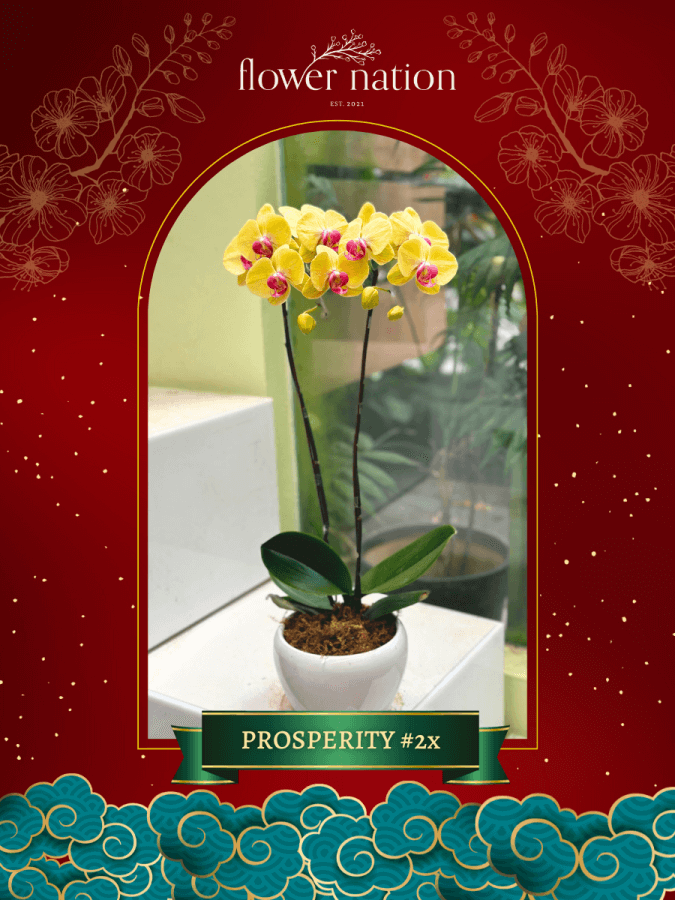 This special flower pot features special yellow orchids. Yellow orchids are often associated with happiness, vitality, friendship, and a fresh start. They are believed to embody the essence of positive energy, bringing light and warmth to even the darkest moments. They are also used to express gratitude and appreciation towards a friend or loved one, as well as to wish them good luck and prosperity. This flower pot is perfect for making a grand impression on your guests or family members during the Chinese New Year.